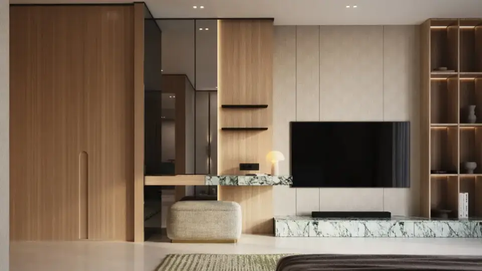 - Sustainable, high-quality materials such as marble, cementitious surfaces, walnut wood, travertine, and custom acrylic paint