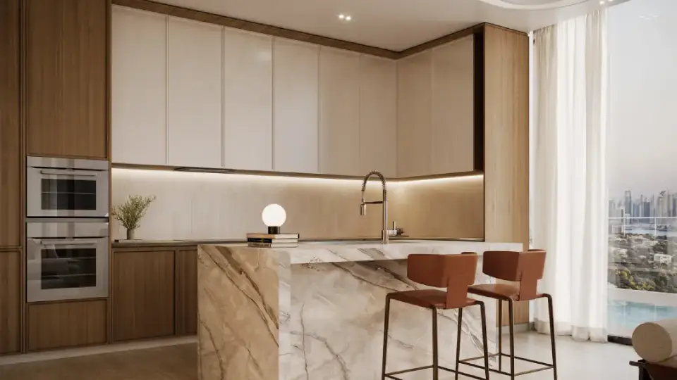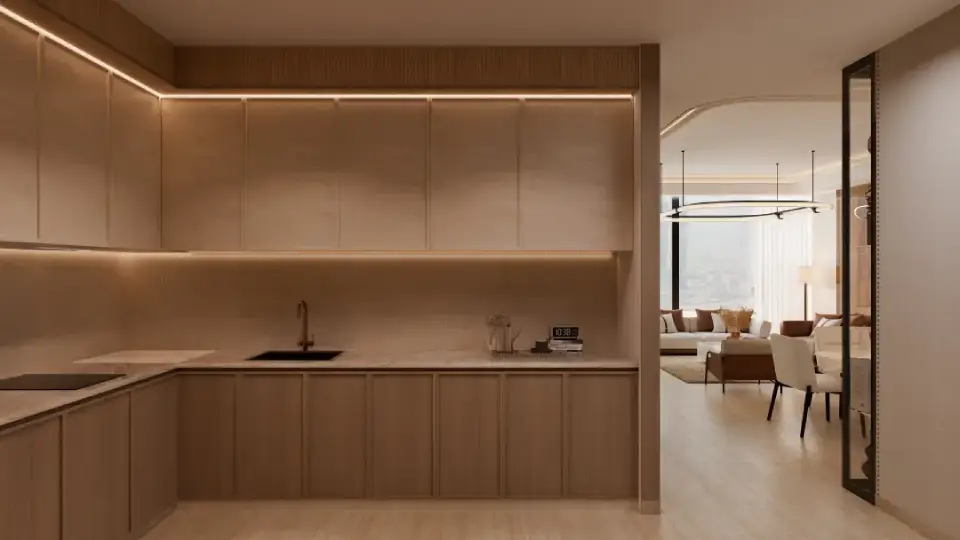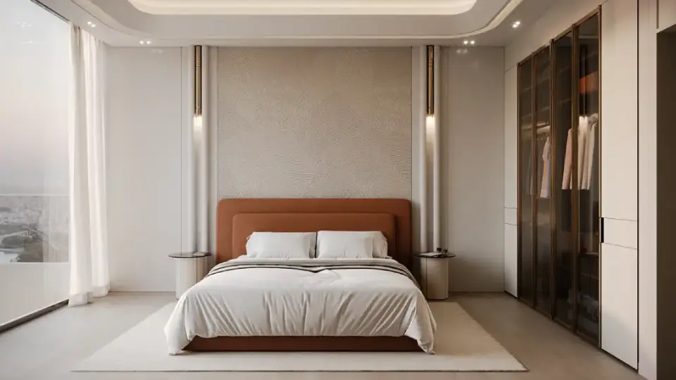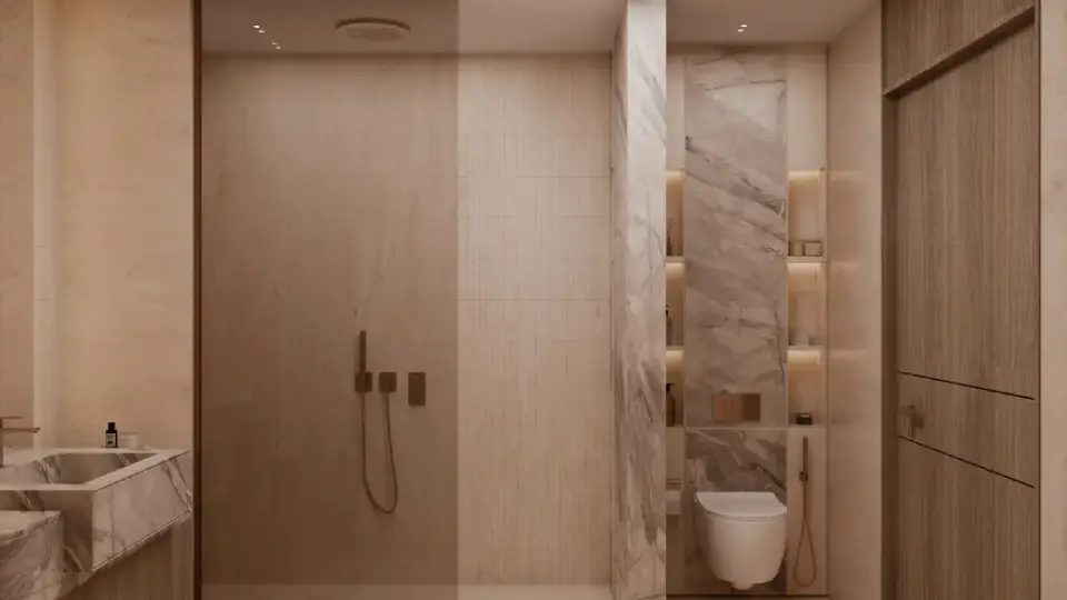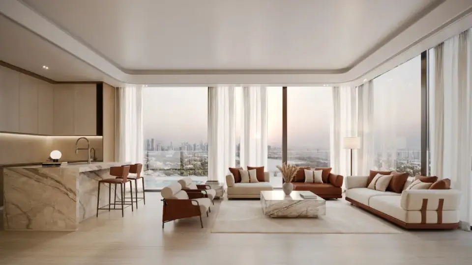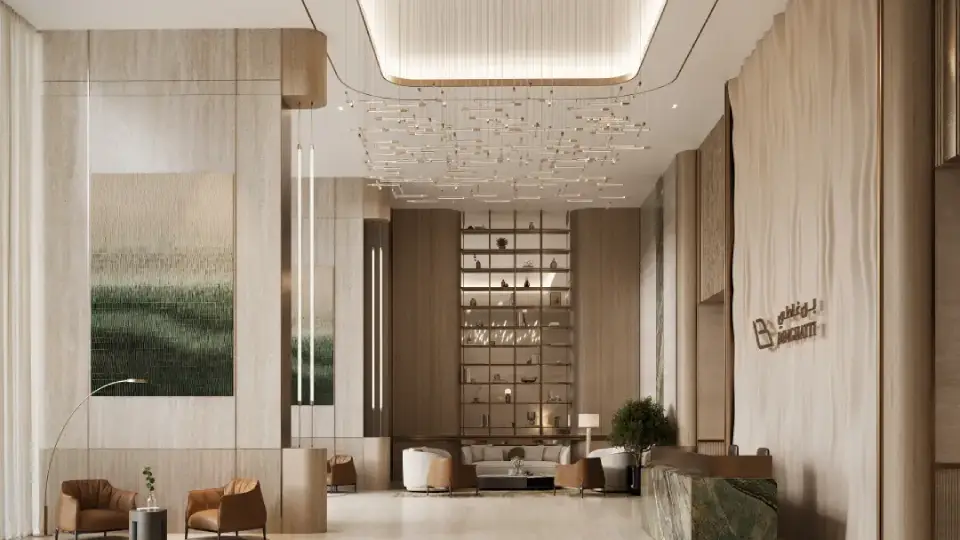 The interiors of Binghatti Vintage reflect Binghatti’s philosophy of “intentional luxury,” with materials and finishes chosen to achieve a perfect balance between understated elegance and functional comfort. Key elements include travertine stone, walnut wood, accent marble, copper, metallic glass, and soft petal-colored tones. Together, these materials create a visually calm and materially rich environment without excess.
