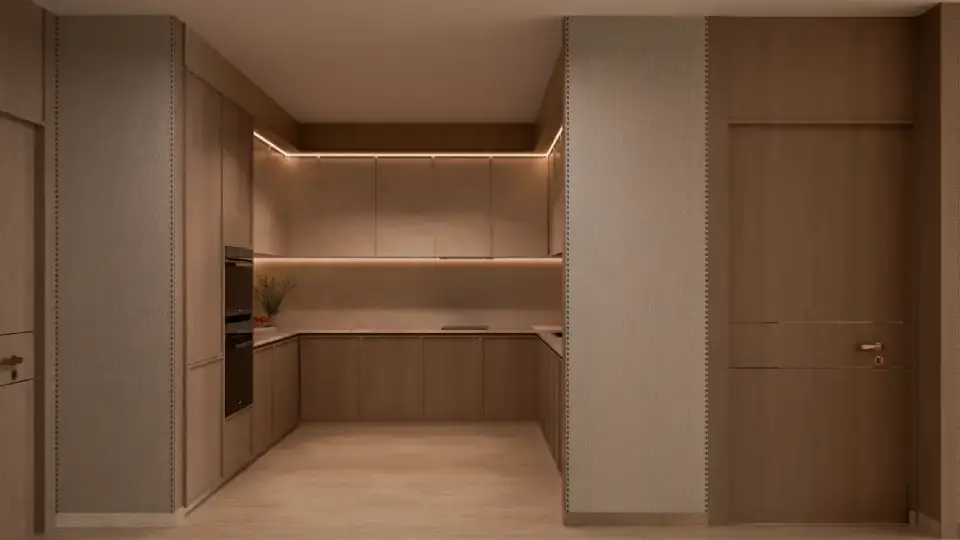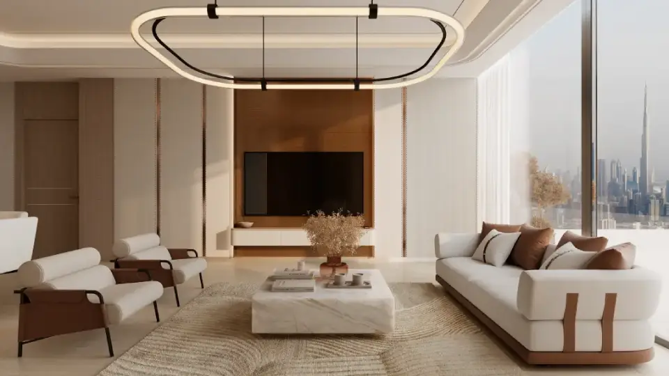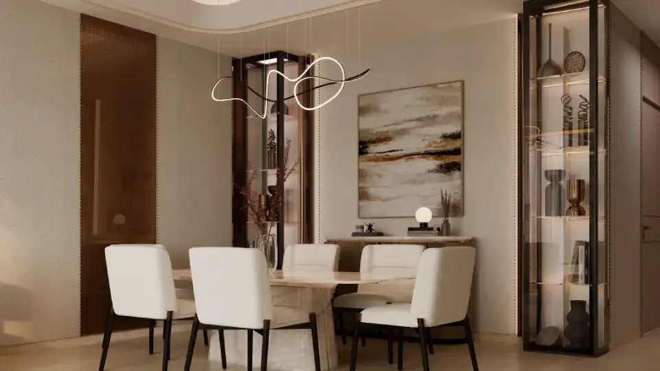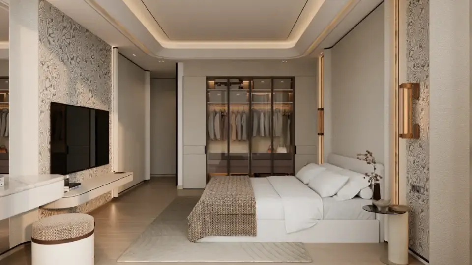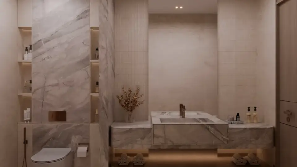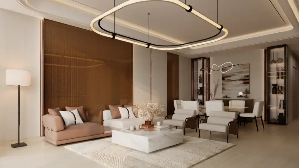 The interiors of Binghatti Vintage reflect Binghatti’s philosophy of “intentional luxury,” with materials and finishes chosen to achieve a perfect balance between understated elegance and functional comfort. Key elements include travertine stone, walnut wood, accent marble, copper, metallic glass, and soft petal-colored tones. Together, these materials create a visually calm and materially rich environment without excess.
