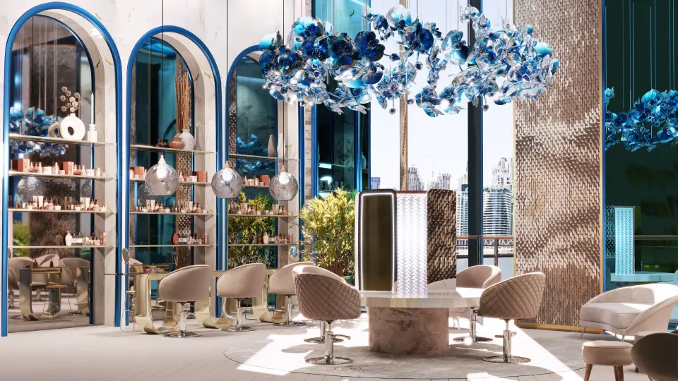 - Beauty Salon: Provides relaxation and energy renewal in a setting of soft colors and sparkling details, inspired by the essence of blue topaz.