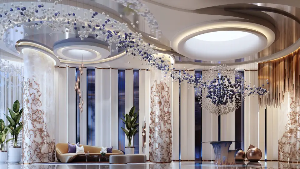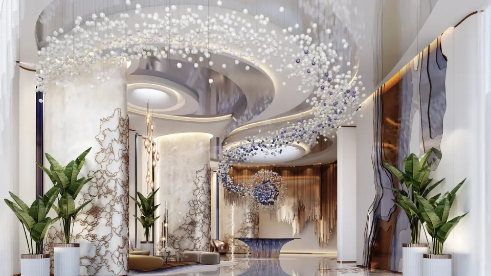 The project draws its aesthetic identity from the philosophy of the Blue Pearl—an essential inspiration behind De Grisogono’s artistic vision. This concept appears in the textures, visual elements, and spatial design, creating harmony between refined luxury and calming natural themes.