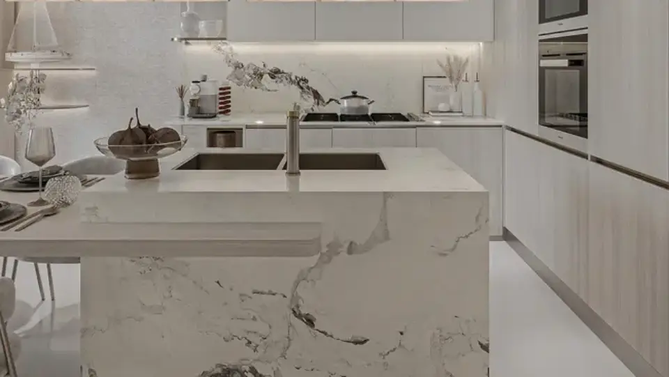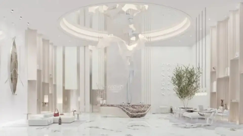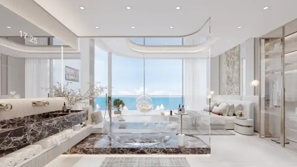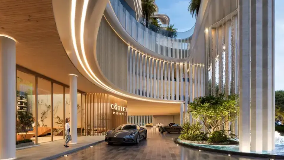 The buildings feature curved lines inspired by wave movements, creating a sense of privacy and belonging, where every corner is a work of art reflecting luxury and harmony with nature.