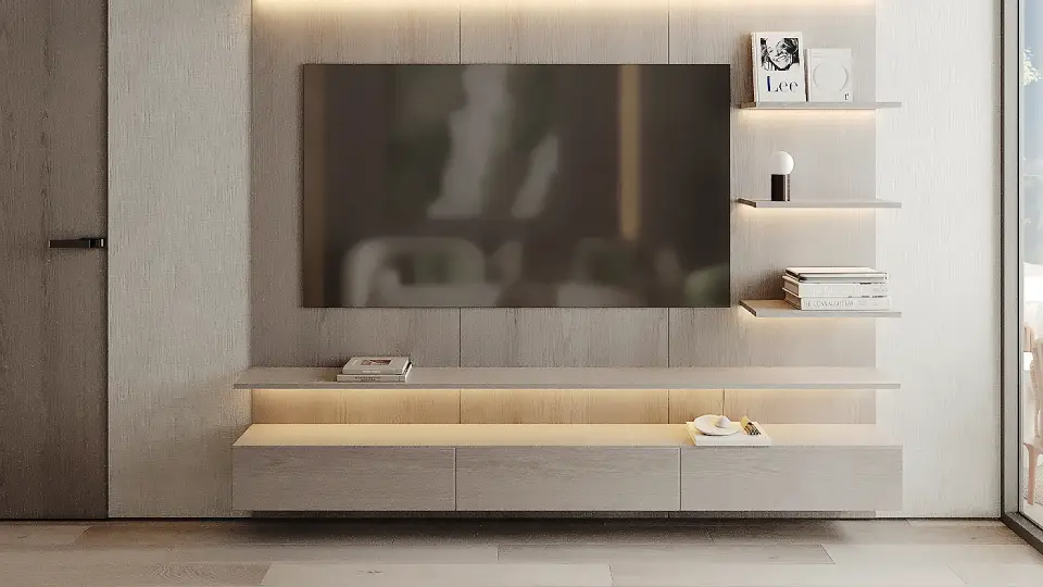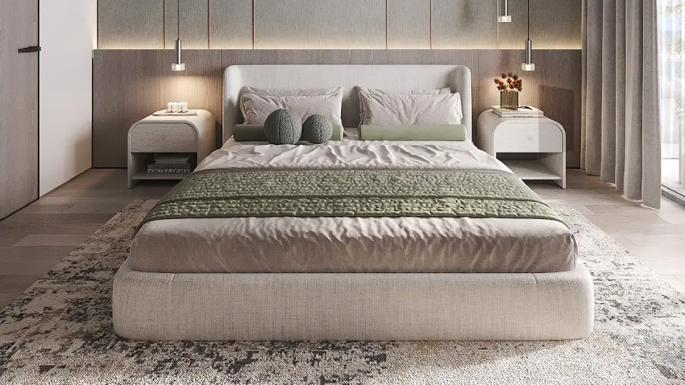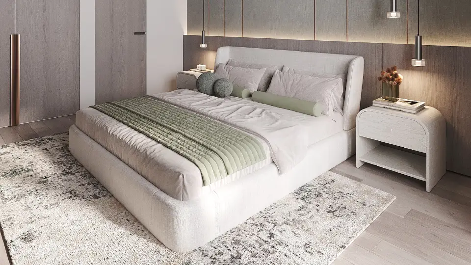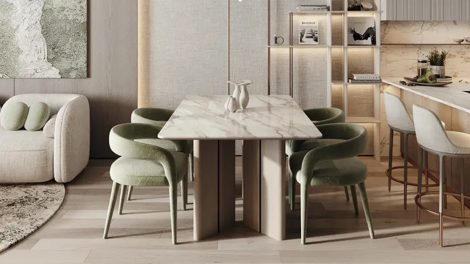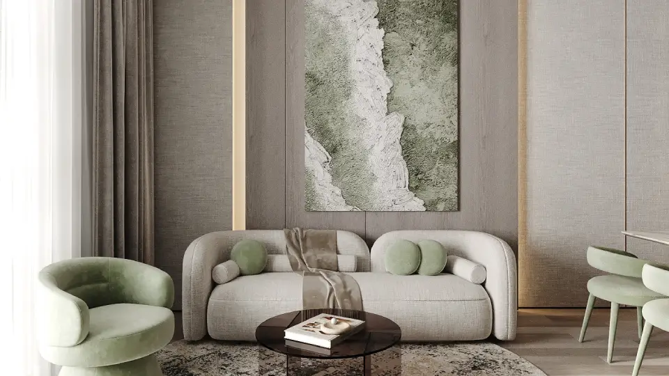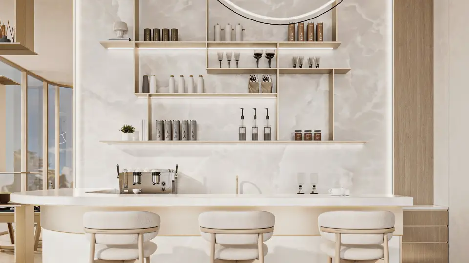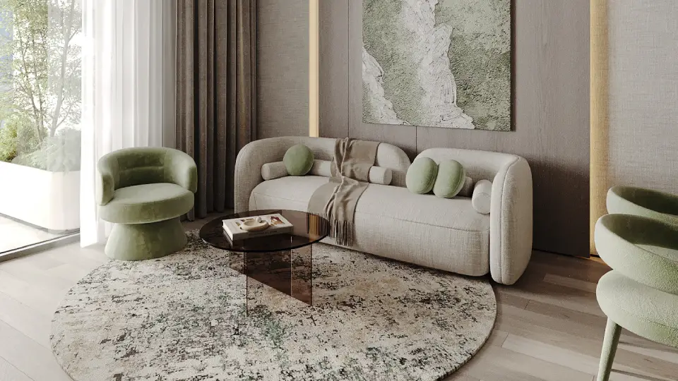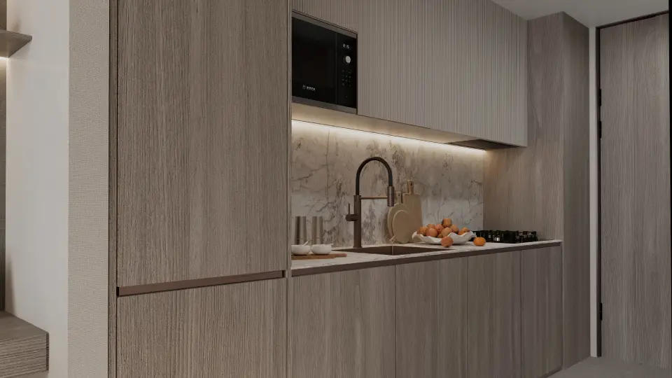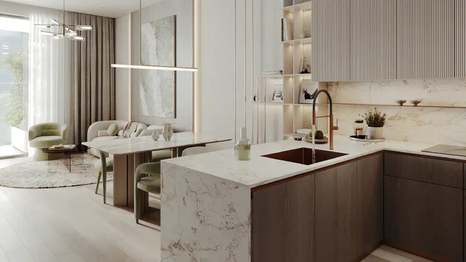 High-quality materials highlight meticulous attention to detail, including fully equipped modern kitchens. The interior design balances clean geometric lines with calming colors, enhancing the sense of spaciousness and tranquility.