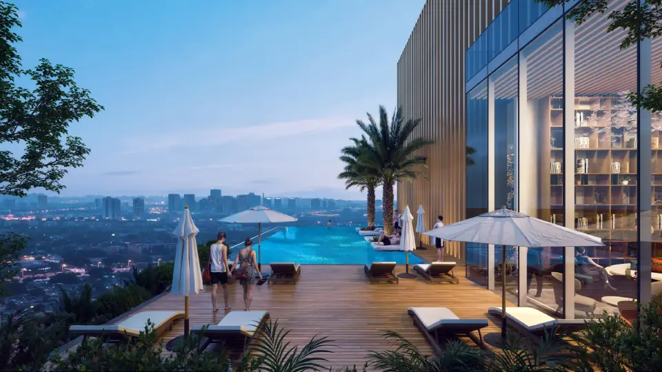 - Infinity rooftop pool with panoramic city views.