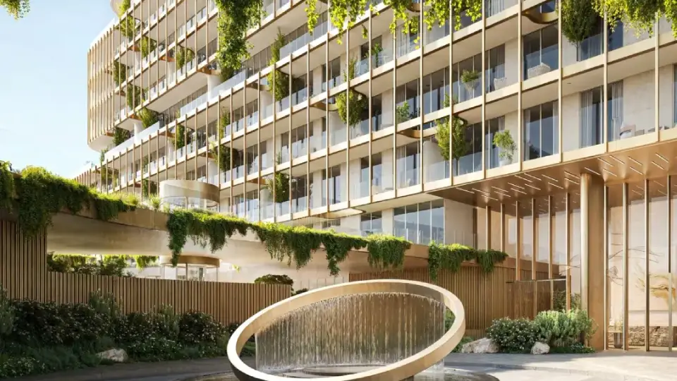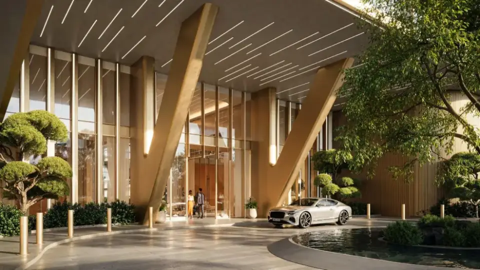 Arrival at HADO BY BEYOND begins under an artistic sculptural canopy with warm bronze tones, water fountains, natural gardens, and paths harmoniously integrated with the architecture, delivering a complete arrival experience.