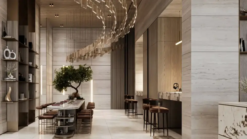 The lobby acts as the gateway to the residential experience. High ceilings, marble flooring, glass elements, and carefully selected wood finishes come together to create a first impression that expresses quiet luxury and thoughtful hospitality.