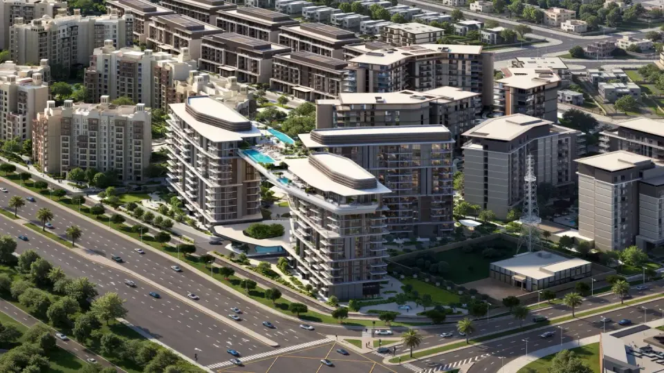 Meraas Nourelle features a contemporary architectural style defined by clean lines and sculptural forms. The design integrates extensive green spaces between the towers, creating a balanced environment that combines nature with modern urban living.