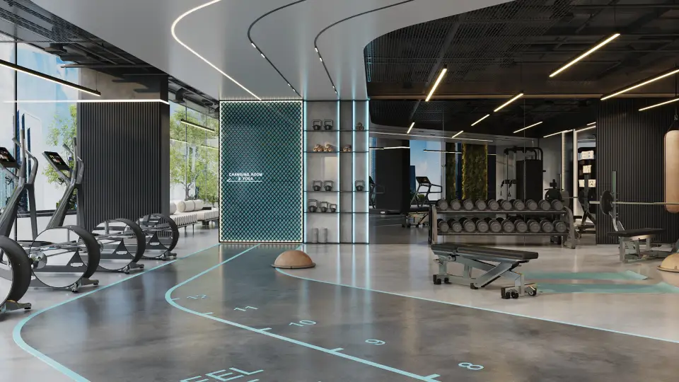 Sports: Indoor and outdoor gyms, CrossFit zones, running and cycling tracks, multi-purpose courts, cricket field.