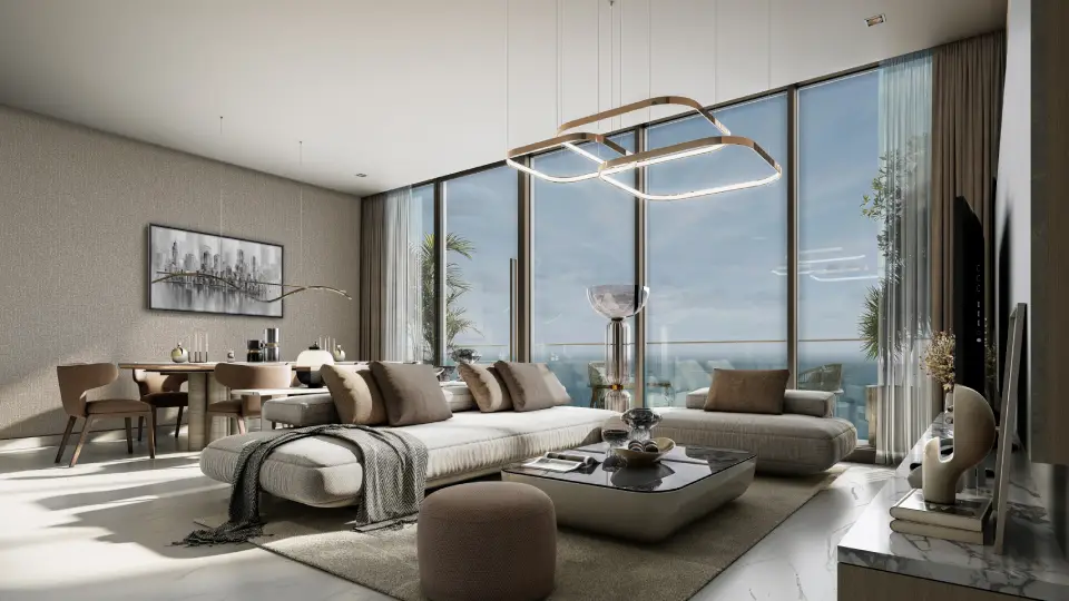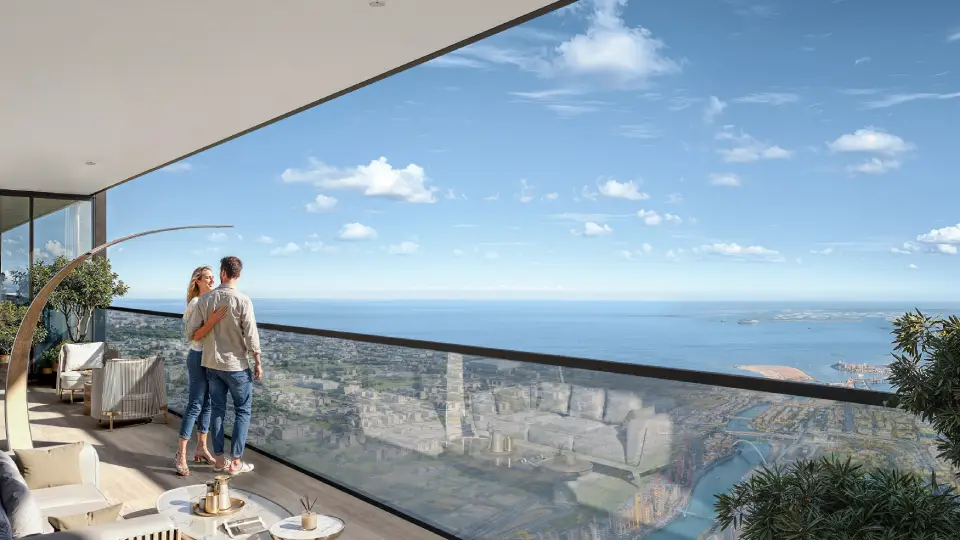 Units range from one-, two-, and three-bedroom apartments to luxury duplexes, all offering spacious interiors, wide balconies, and panoramic views of Dubai.