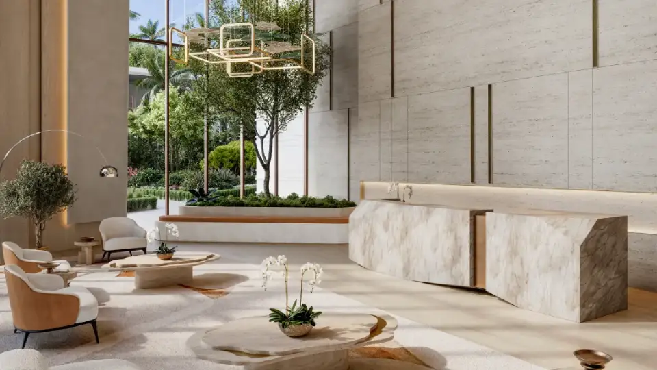 - Lobby and Reception: Luxurious, minimalist design with natural light, water, and garden views