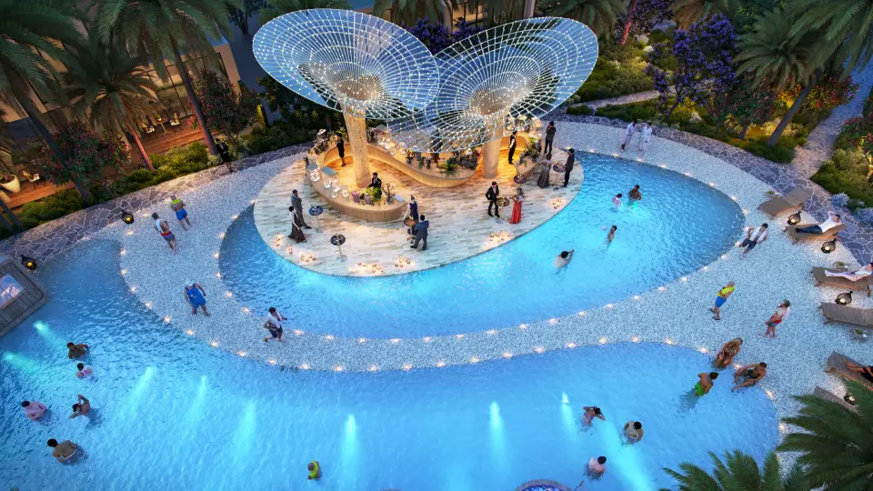 - Artificial beach, aqua cabanas, swimming pool, and relaxation zones