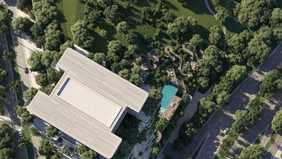The project does not treat the building as a standalone structure. Instead, it presents it as a living entity that grows organically from its surroundings. Smooth architectural lines flow naturally, vertical greenery ascends through the façade, and expansive glass surfaces reflect the sea, sky, and natural light. This approach dissolves the traditional boundaries between built form and nature.