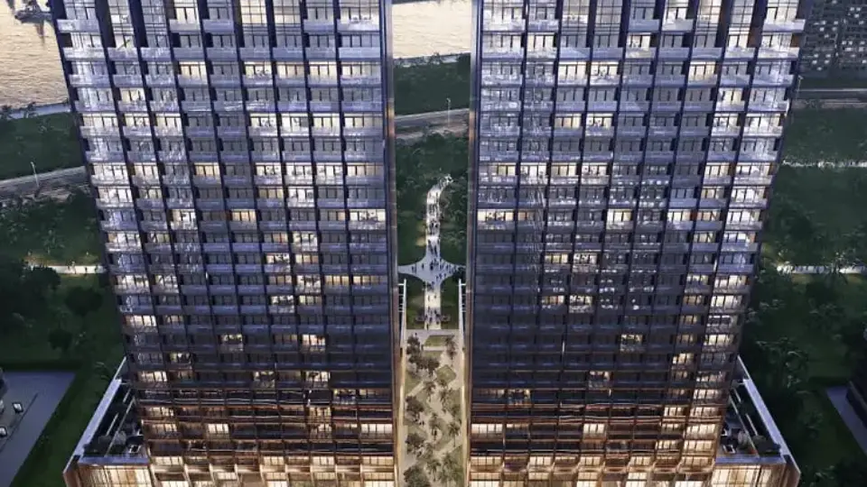 The Sterling by OMNIYAT stands as one of the most distinguished luxury residential developments in the heart of Dubai. Strategically located between the iconic Burj Khalifa and the Dubai Water Canal, within the Business Bay district and directly adjacent to Downtown Dubai, the project features a unique architectural design comprising twin residential towers with harmonious heights. The design ensures that the towers create a striking visual landmark on the city’s skyline.