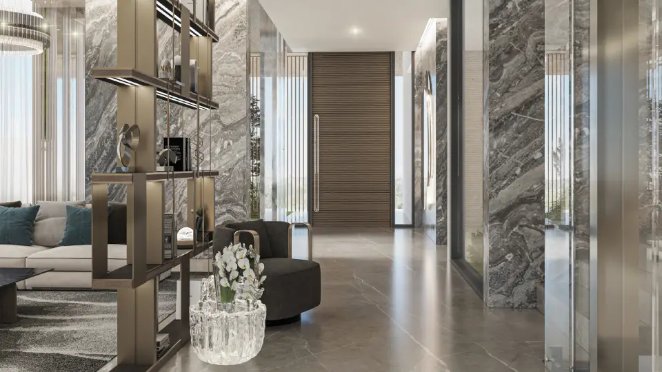 - Living and dining areas: Polished marble floors with painted walls and feature accent walls.