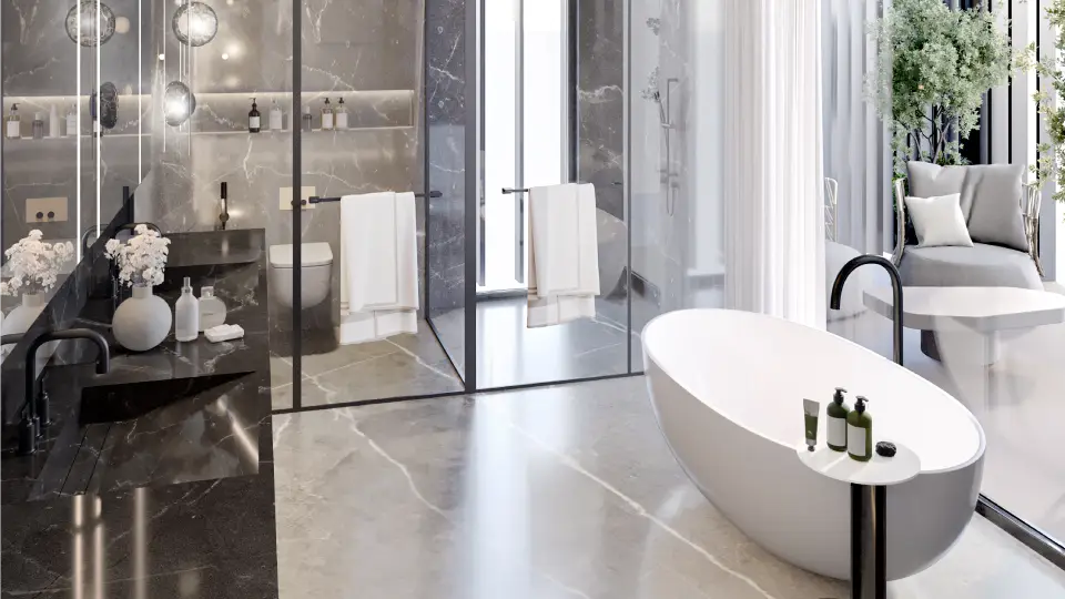 - Bathrooms: Ceramic tiles, fitted vanities, stone ceilings, mirrors, and glass partitions.