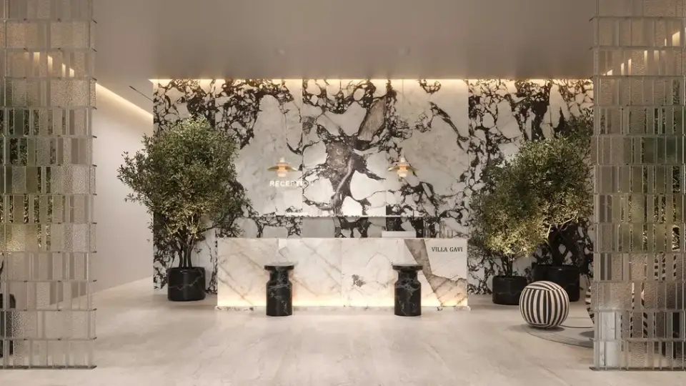 - Villa Del Gavi Lobby: Marble and travertine floors, elegant fireplaces, and a serene tea lounge adorned with selected Italian and French artworks